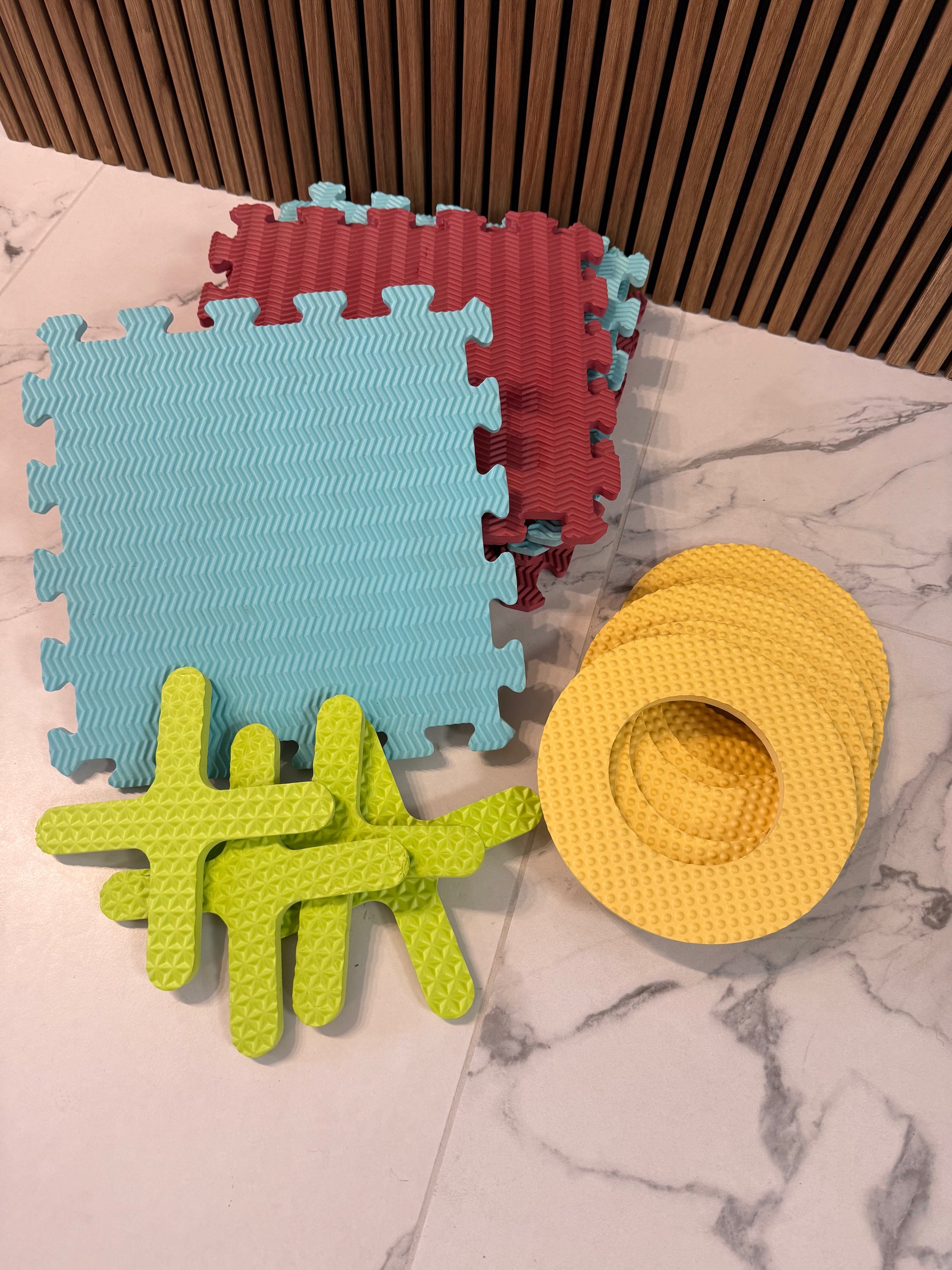 Linksmas ir spalvingas sensorinių kilimėlių rinkinys mažiesiems – puikiai tinka pirmiems žingsniams, žaidimams ar smulkiajai motorikai lavinti!