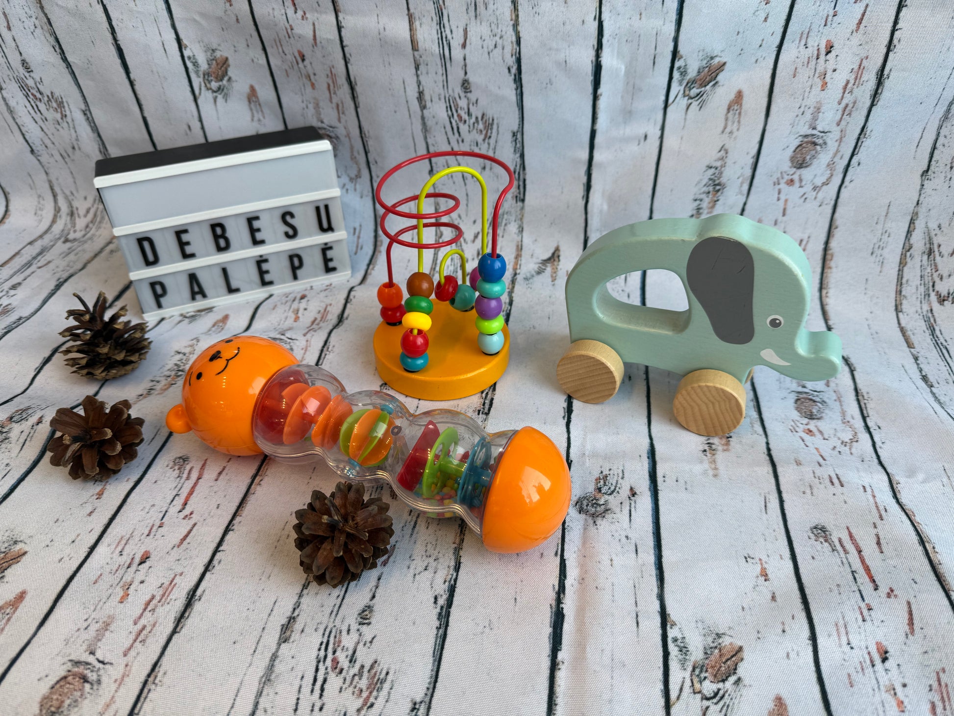 Žaismingas ir lavinantis naudotų, bet puikios būklės žaislų rinkinys, sukurtas mažylių motorikai, smalsumui ir pojūčių pasauliui pažadinti!