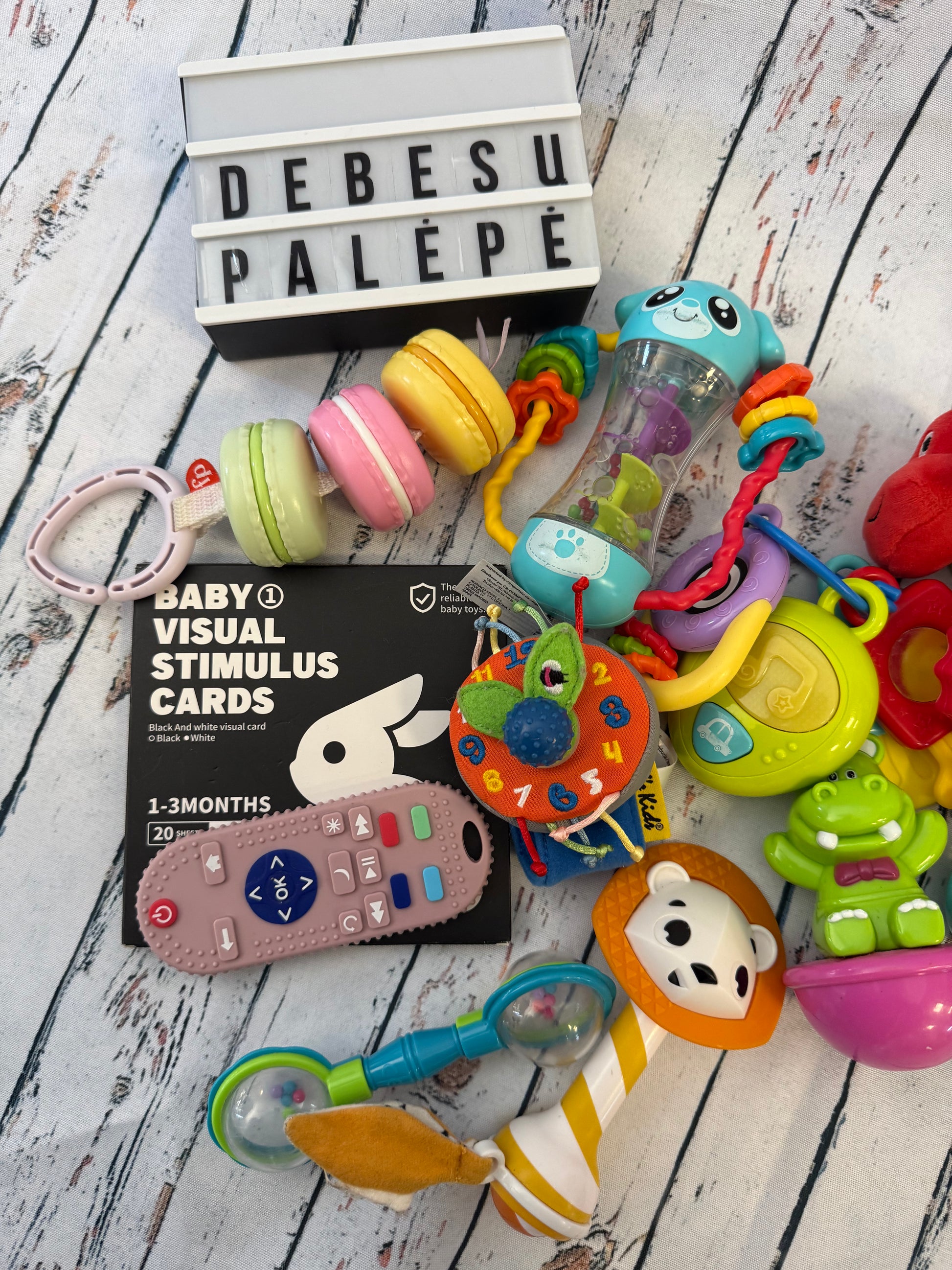 Rinkinyje – įvairūs barškučiai, kramtukai, sensoriniai žaislai ir kortelės, kurie padeda mažyliui tyrinėti aplinką ir lavinti pirmuosius įgūdžius.