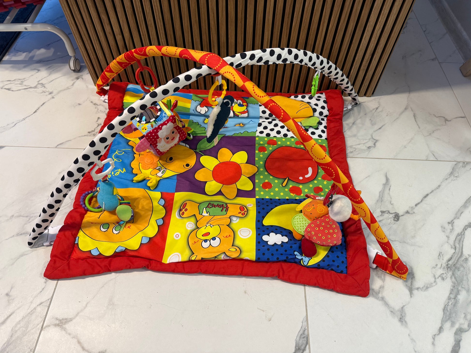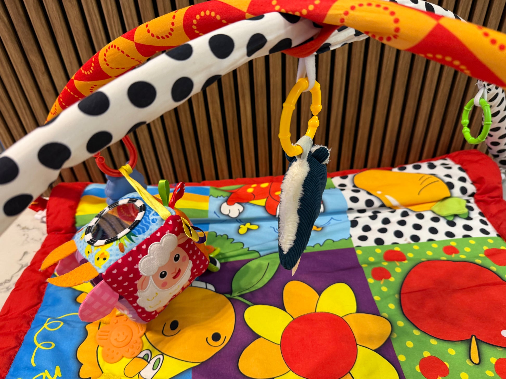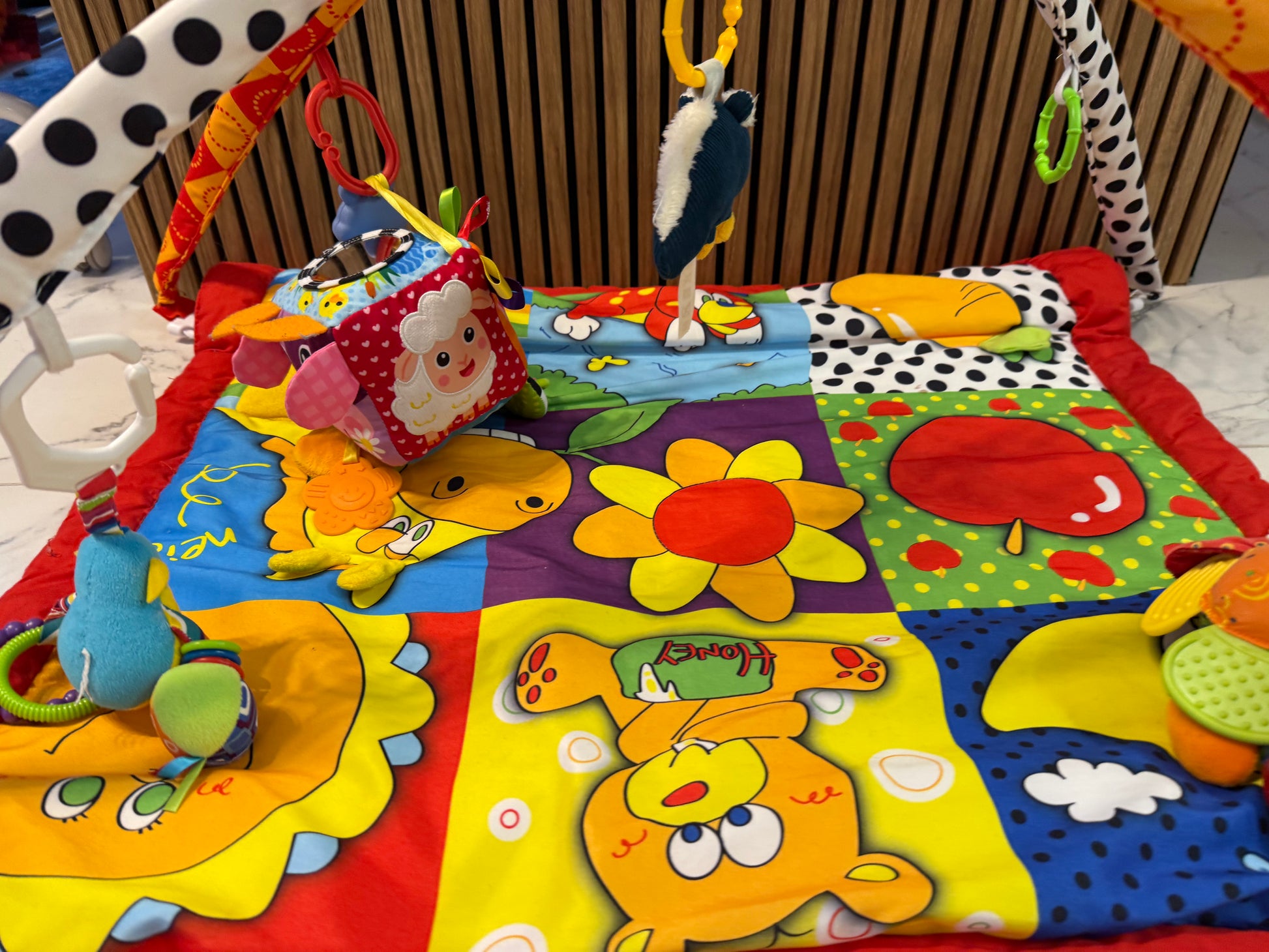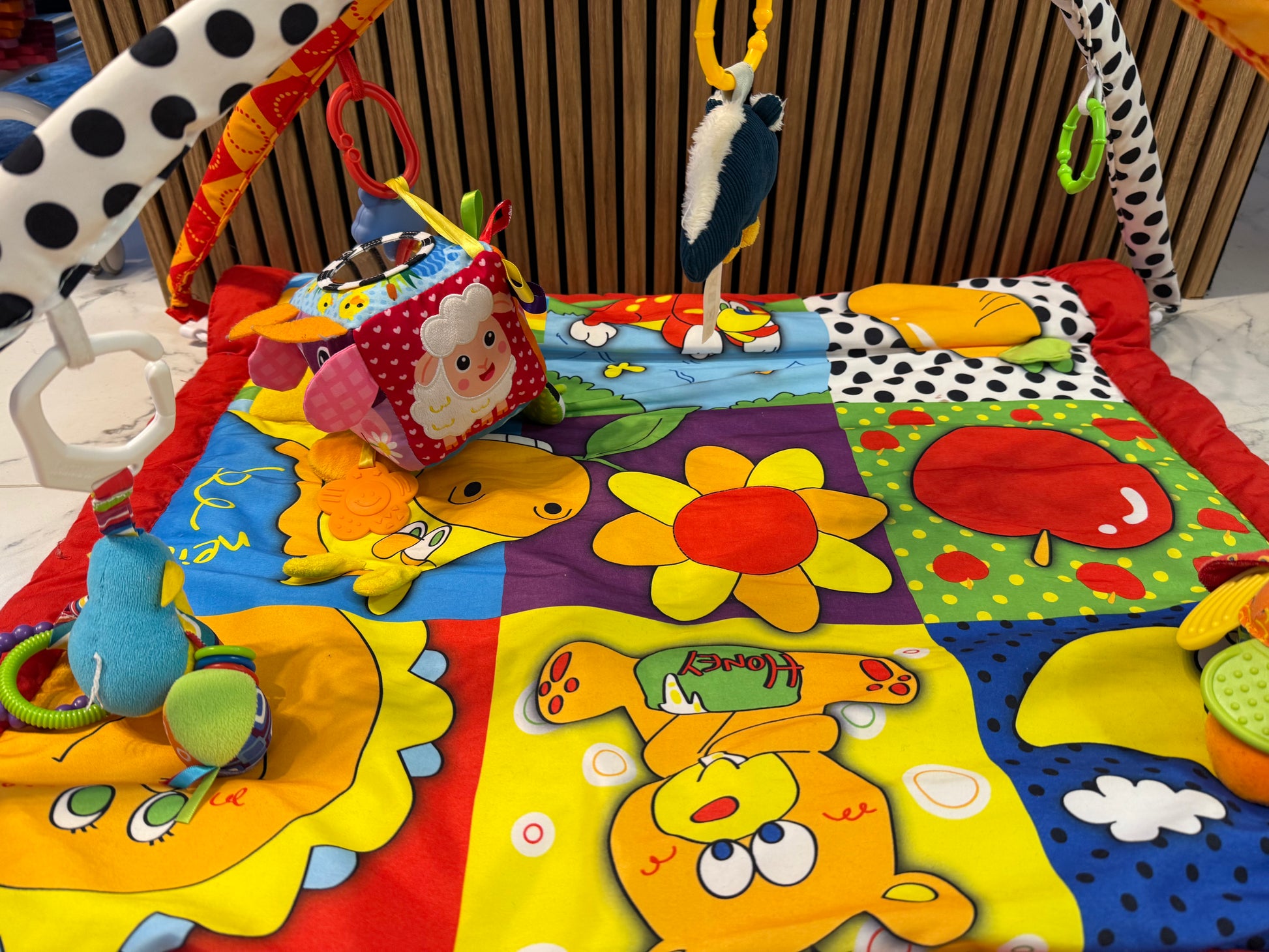 Spalvingas ir minkštas lavinamasis kilimėlis su lankais, skirtas kūdikių žaidimui, judesiui ir pojūčių lavinimui.