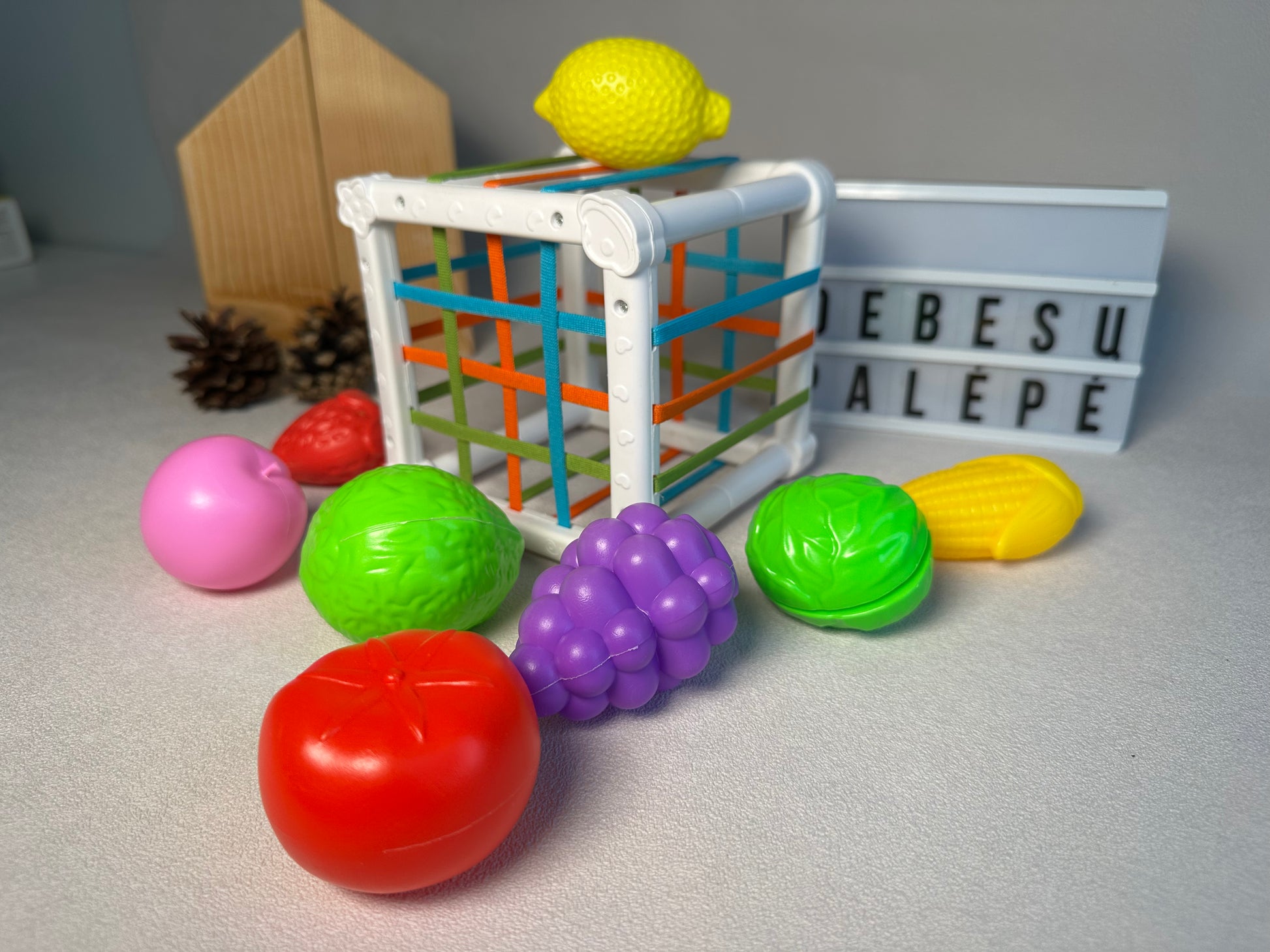 🍇 Rinkinį sudaro kubas su kaspinėlių tinklu + įvairūs vaisiai ir daržovės