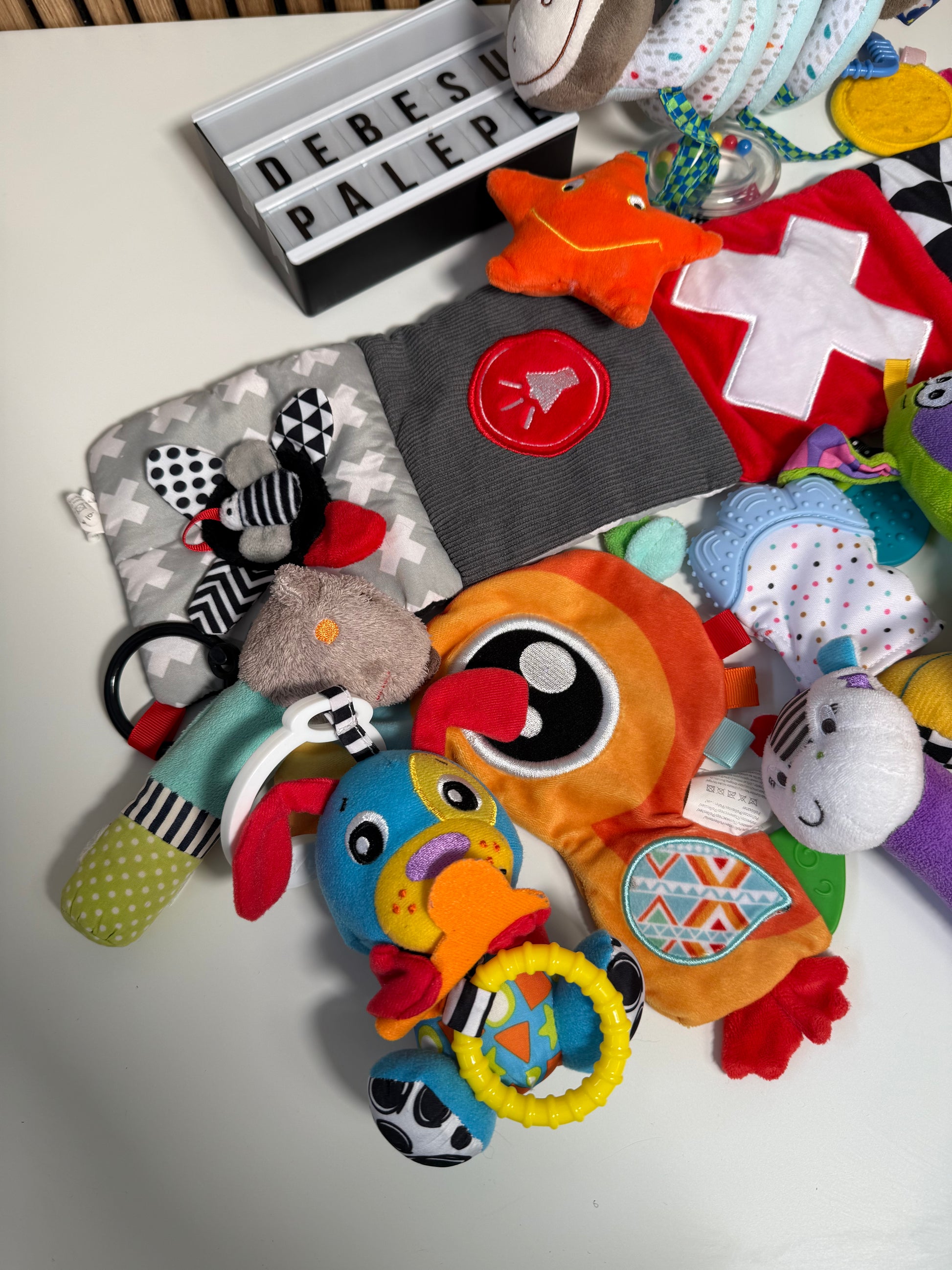 Spalvingas ir įvairių pojūčių pilnas sensorinių žaislų rinkinys, skirtas patiems mažiausiems. Skirtingos tekstūros, garsai, veidrodėliai, kramtukai ir barškučiai kviečia tyrinėti, liesti, klausytis ir žaisti.
