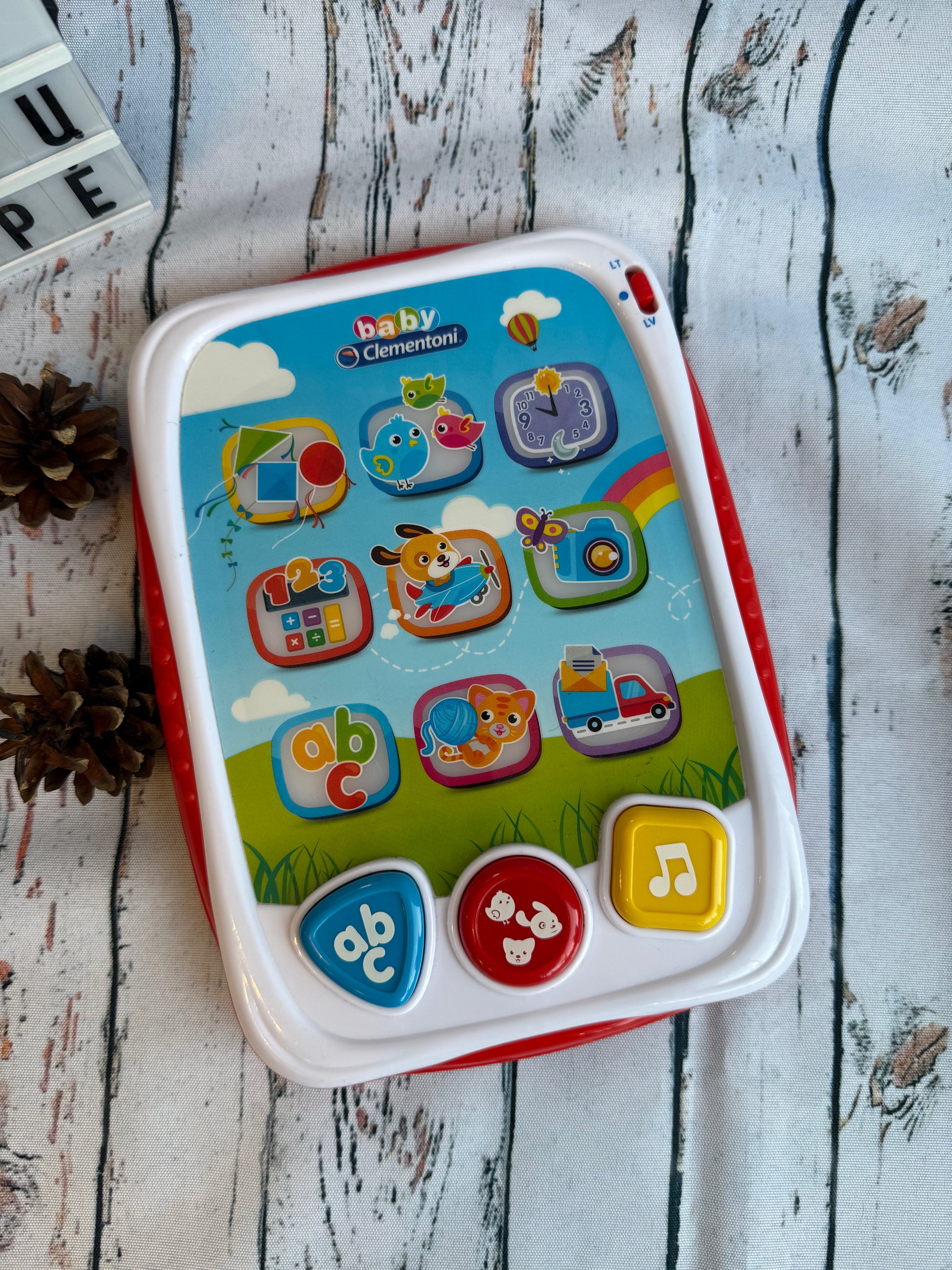 Paspaudus mygtukus, vaikas susipažįsta su raidėmis, skaičiais, garsais, melodijomis ir linksmais personažais. Žaislas lavina kalbos suvokimą, klausą, dėmesį bei smulkiąją motoriką.