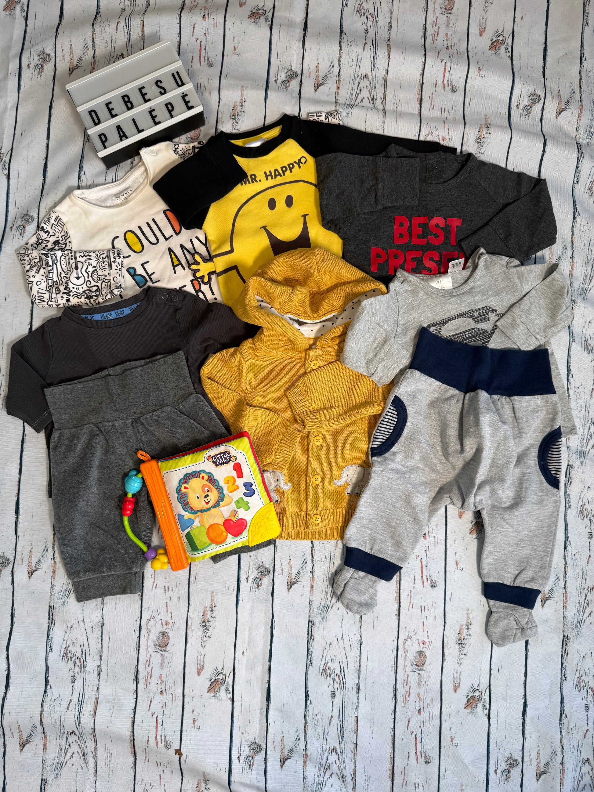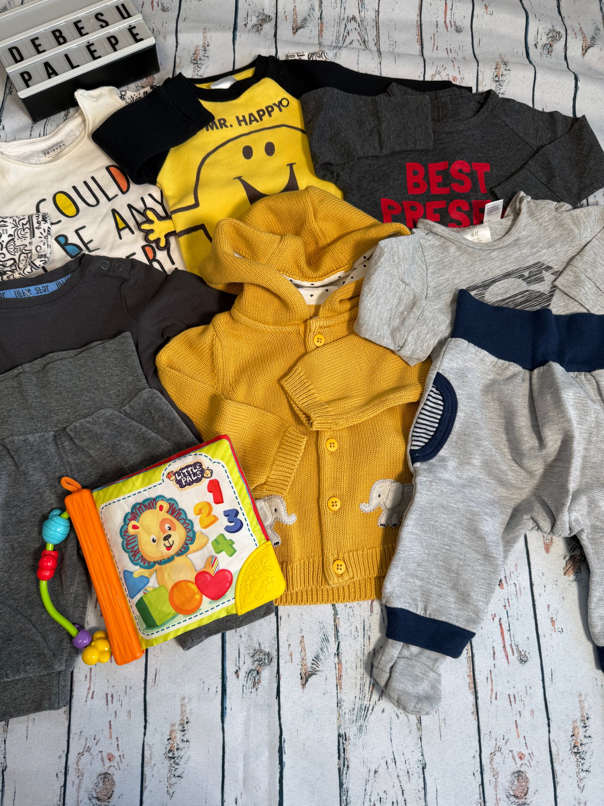 Linksmas, spalvingas ir kupinas vaikiško džiaugsmo! Šis 50–56 dydžio rinkinukas puikiai tiks smalsiam mažyliui, mėgstančiam patogumą ir švelnumą. 💛